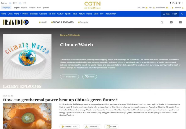 日前,中国国际电视台(CGTN)气候观察(Climate Watch)栏目播出了题为“How can geothermal power heat up China's green future?”的专题访谈节目。冰岛可再生能源联合组织首席执行官Rósbjörg Jónsdóttir、91大神