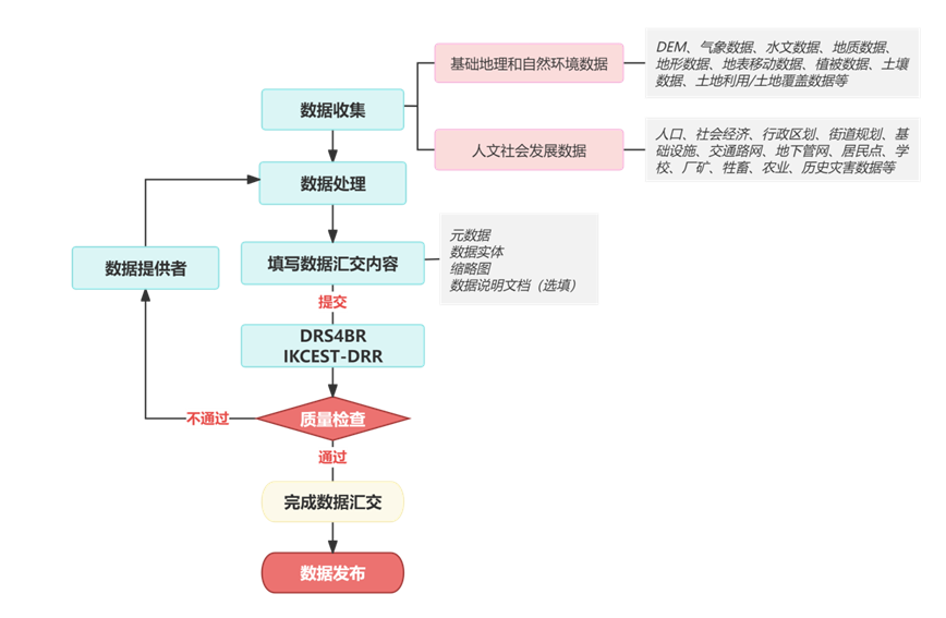 数据汇交时,需提交元数据、数据实体、缩略图以及数据说明文档(可选)等必要内容,以确保数据的完整性、规范性和可重用性。汇交后的数据将通过一带一路减灾服务系统(DRS4BR)和UNESCO国际工程科技知识中心防灾减灾知识服务系统(IKCEST-DRR)发布。