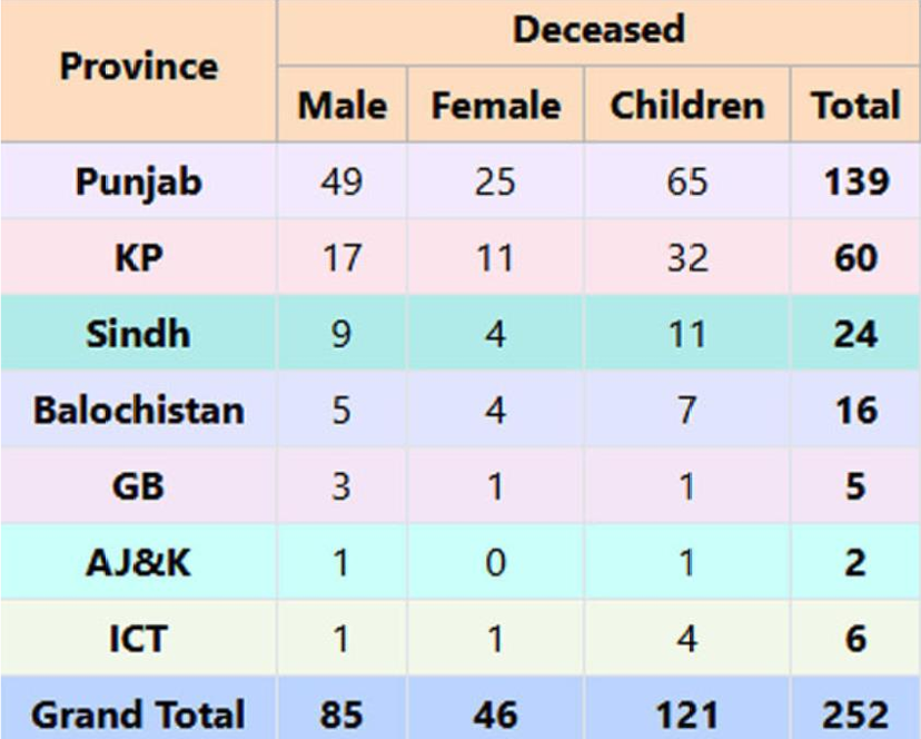 Punjab has recorded the highest number of fatalities with 139 deaths, followed by K-P with 60. Other severely affected regions include Sindh, which has reported 24 deaths, and Balochistan with 16.