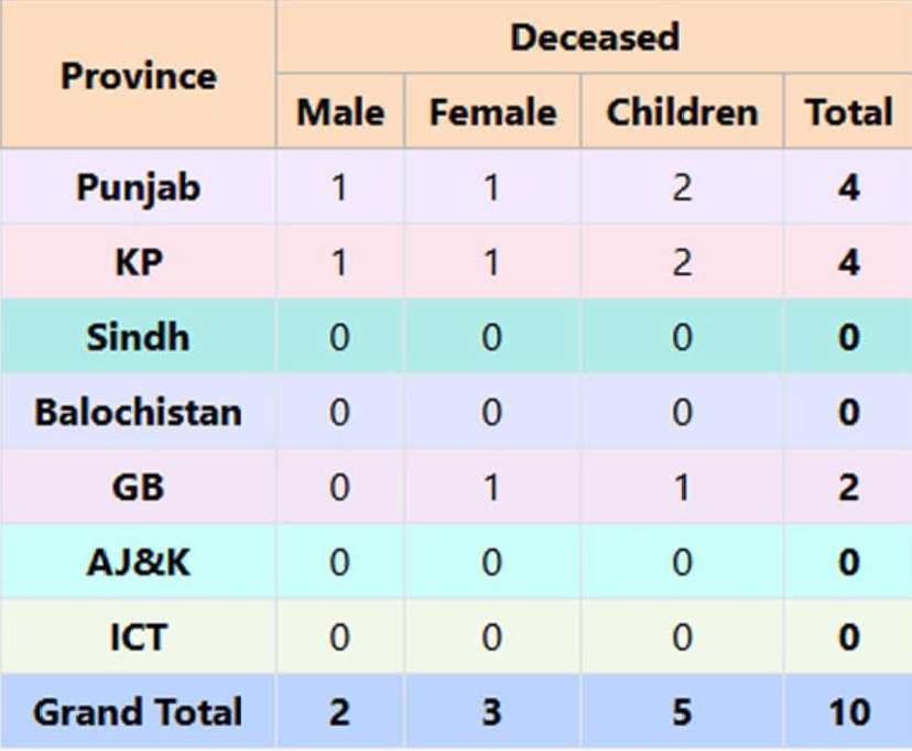 According to the NDMA, four deaths were reported in Punjab, four in Khyber-Pakhtunkhwa (K-P), and two in Gilgit-Baltistan (G-B). No casualties were reported in Sindh, Balochistan and Azad Kashmir.