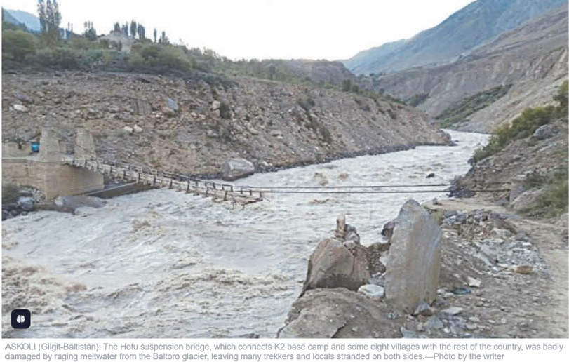Moreover, river erosion caused the collapse of the Hotu suspension bridge in Shigar, cutting off the only access to the K2 base camp. A large number of foreign expedition members and trekkers were stranded, while eight villages were also disconnected.