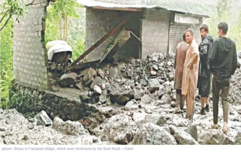 GILGIT: A cloudburst-induced flood swept through the Ishkoman valley of Ghizer district on Wednesday, damaging dozens of homes, shops and critical infrastructure, including a power station, the Gilgit-Baltistan Disaster Management Authority (GBDMA) said.