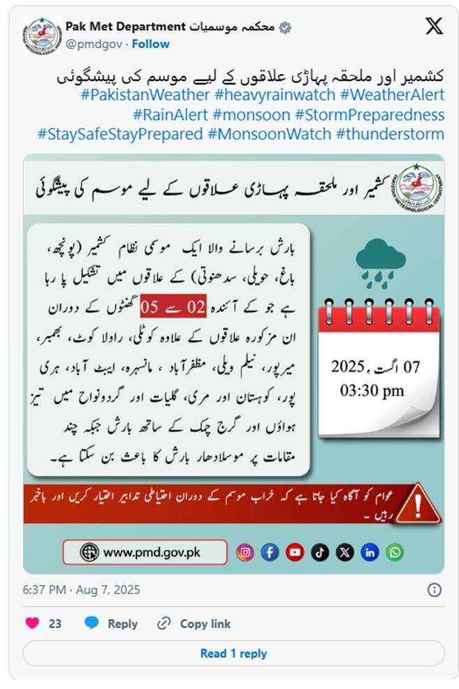 According to the post, the system was likely to cause “heavy rain with strong winds and thunderstorms” during the next 2-5 hours in the above-mentioned areas as well as Azad Kashmir’s Muzaffarabad, Kotli, Rawalakot, Bhimber, Mirpur and Neelum Valley.