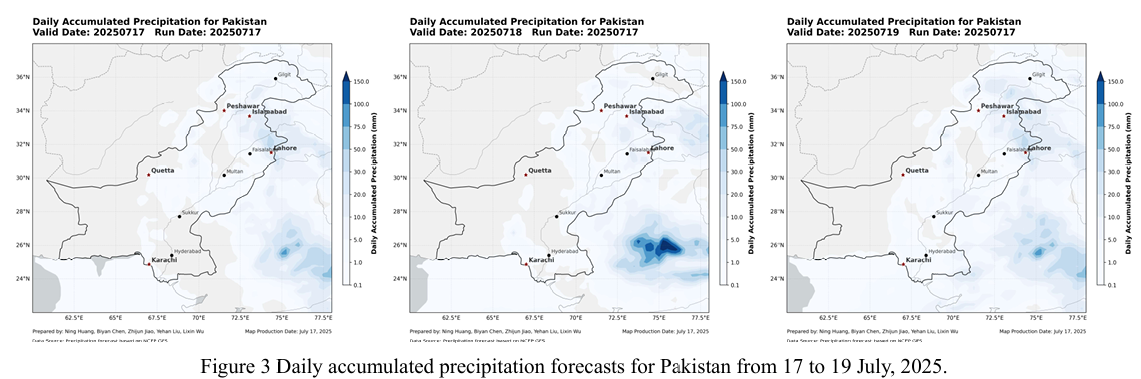 According to cloud imagery from the FY-4A and FY-4B geostationary meteorological satellites on July 17, as shown in Fig. 2, a large amount of atmospheric moisture remains over Punjab and Sindh Provinces, suggesting that weather conditions are still unfavorable and the risk of continued rainfall persists. However, based on precipitation forecasts from the NCFP GFS global model (Fig. 3), rainfall intensity in the coming days is generally expected to decrease, which may help mitigate the flood situation in the region. Nevertheless, given ongoing uncertainties in the evolution of the weather system, the forecast results should be interpreted with caution. Continued monitoring is recommended to support dynamic disaster response planning and the gradual transition toward post flood recovery.