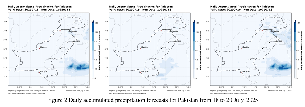 However, precipitation forecasts from the NCFP GFS global model (Fig. 3) show no significant rainfall events expected between July 18 and 20, with an overall weakening trend in rainfall intensity. This may help alleviate the ongoing flood situation and provide a relatively favorable meteorological window for drainage and post disaster recovery operations.