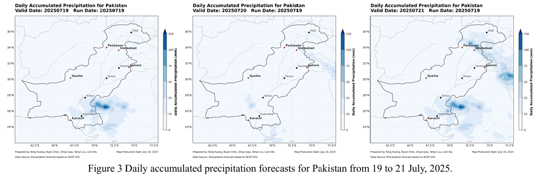 Meanwhile, according to the forecast output from the NCFP GFS global precipitation model (Fig. 3), rainfall across most parts of Pakistan is expected to remain generally weak during July 19–21, 2025, with a decreasing trend in precipitation intensity. However, model outputs suggest that by July 21, a new round of significant rainfall may affect the northern mountainous areas of Islamabad and Peshawar, raising concerns about localized heavy precipitation events. Given the inherent uncertainties of numerical weather prediction models, these forecasts should be interpreted with caution and integrated with real-time observations from FY-4A/4B and other multi source remote sensing and ground-based monitoring systems for dynamic assessment.