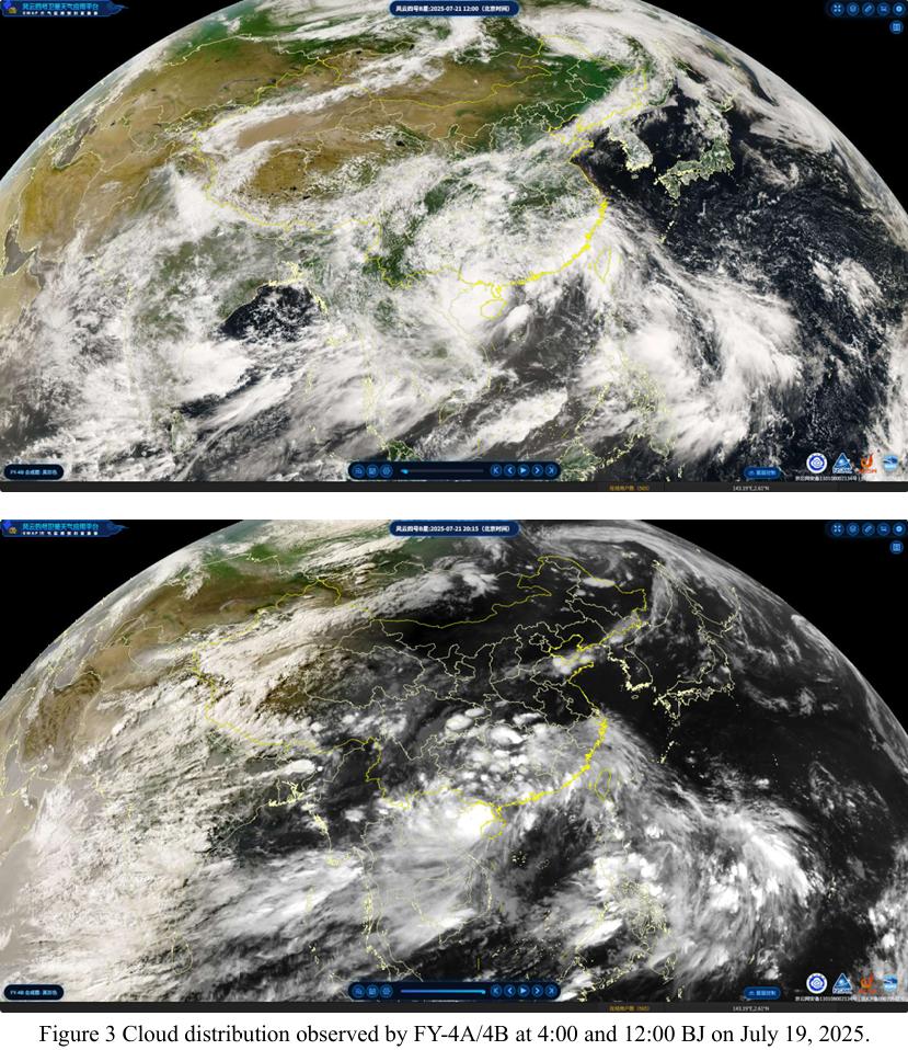 On July 21, 2025, the latest cloud imagery acquired by the FY-4B geostationary meteorological satellite (Fig. 3) indicates that at 04:00 UTC, parts of Pakistan experienced a brief period of clear skies. However, by 12:00 UTC, moisture-laden cloud bands had once again covered the entire country, indicating a highly unstable atmospheric structure with intense regional convection and a significantly increased risk of short-duration heavy rainfall. After 12:00 UTC and into the nighttime, there is a heightened risk of heavy rainfall events, which may lead to severe flood hazards.