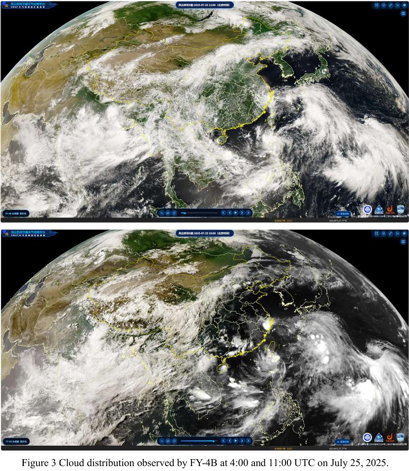 Fig.3 为 FY-4B卫星于7月25日获取的云图。UTC时间11时数据显示,巴基斯坦大部地区天气晴朗,仅信德省局部及北部吉尔吉特-巴尔蒂斯坦(GB)与开伯尔-普赫图赫瓦省(KP)山区出现一定云层覆盖,其中北部山区云量较重。