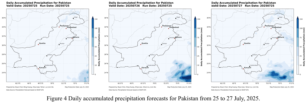 Fig.4 基于NCFP GFS模型的未来降水预报显示,7月25日至26日期间, 除KP和GB北部山区可能出现小幅降水外,巴基斯坦其余大部地区无明显降水过程。短期内天气形势有利,为洪涝救援与灾后恢复工作提供了关键窗口期。