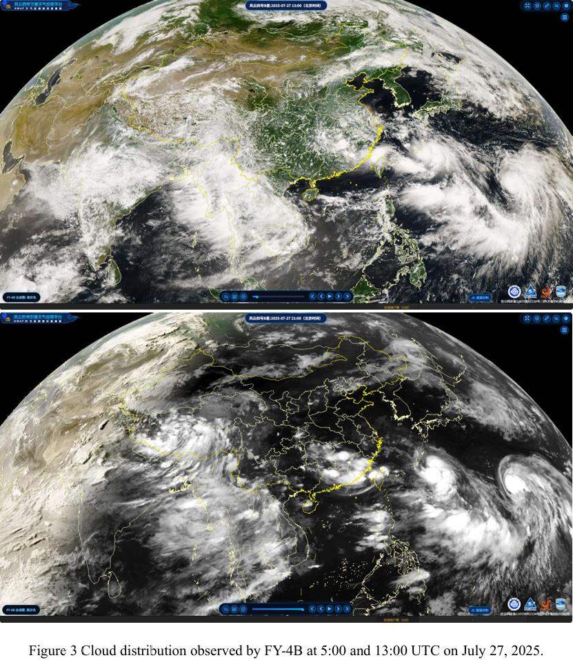 Fig.3 displays cloud cover derived from FY-4B geostationary meteorological satellite imagery between 09:00 and 13:00 UTC on July 27. Rapid cloud formation and expansion were observed along the Punjab–Sindh provincial boundary, suggesting rapid atmospheric changes.