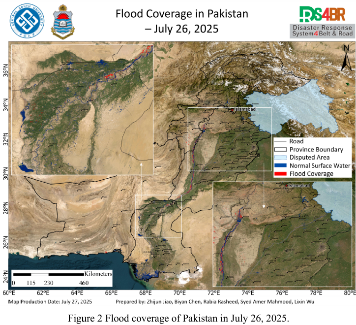 Fig.2 shows the inundation extent as of July 26. However, the dataset only covers parts of Sindh and Punjab provinces, primarily along the main course of the Indus River. The imagery indicates that water-covered areas have remained stable, with no further flood expansion.