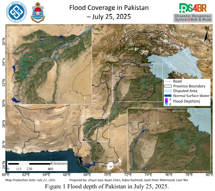 Based on multi-source remote sensing data acquired on July 25–26, 2025 from Sentinel-1, Sentinel-2, Landsat-8, and Landsat-9, the KDFIMv2 algorithm was employed to perform the latest dynamic monitoring and integrated assessment of flood inundation extent and water depth across Pakistan.