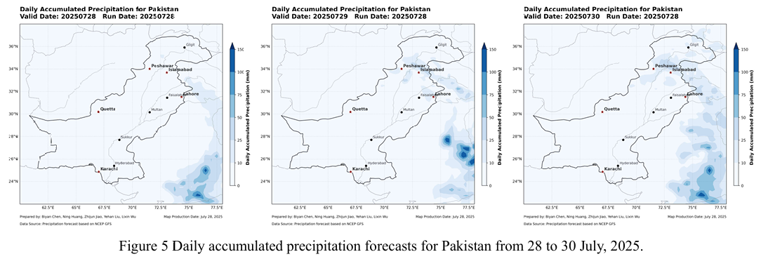 Fig. 5 provides the NCFP GFS global precipitation forecast. The model predicts a new round of widespread precipitation over KP and Gilgit-Baltistan (GB) regions on July 28–29, which may exacerbate mountain runoff and increase the risk of secondary geological disasters. Proactive flood preparedness is advised.