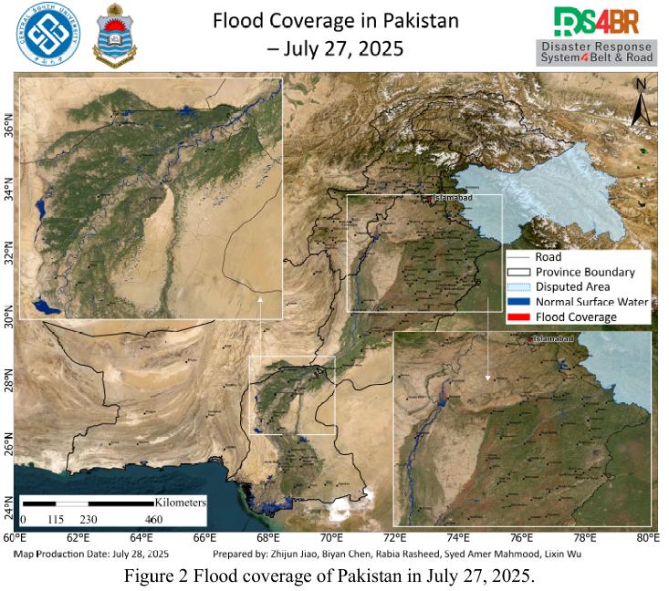 Fig. 2 presents the flood inundation extent on July 27, based on data covering parts of Punjab Province. A significant reduction in inundation extent was observed, suggesting accelerated flood recession with no signs of further expansion.