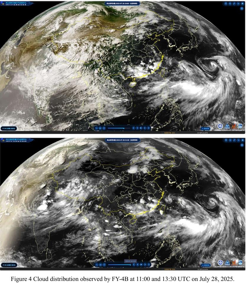 Fig. 4 shows FY-4B geostationary satellite cloud imagery from 11:00 UTC on July 27. A large convective cloud mass formed over southern Khyber Pakhtunkhwa (KP) and rapidly moved northward, indicating the potential for short-term heavy rainfall or severe convective weather. Continuous monitoring is recommended.