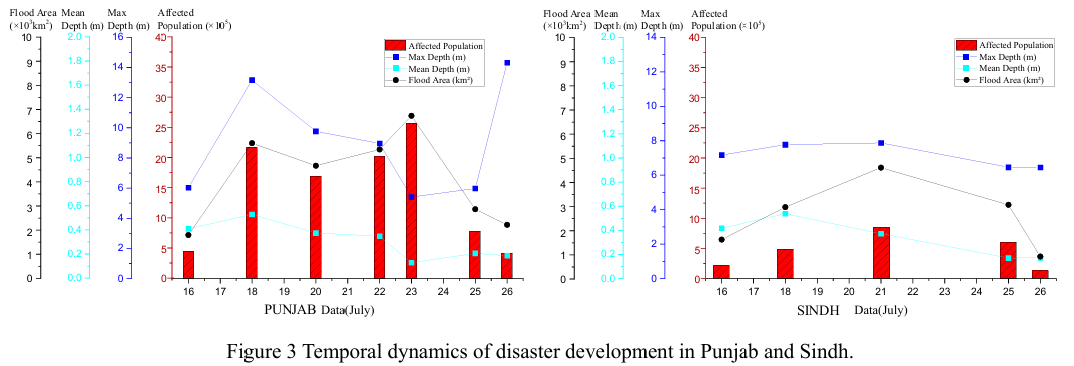 Fig. 3 illustrates the temporal evolution of flood conditions in Sindh and Punjab provinces since July 16, 2025. Remote sensing-based assessment indicates that Punjab experienced significantly larger inundated areas and a higher number of affected populations compared to Sindh. Most flooded regions exhibited water depths below 0.5 meters, while maximum depths exceeding 10 meters were observed in major river channels and reservoir zones. Overall, the flooding situation is currently in a continuous recession phase.