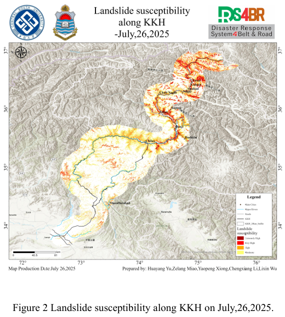 评估结果显示(图2),7月26日易发性结果与25日高易发区空间分布大致相似,但在范围上有所减少。极高与高易发区仍主要沿北部河谷走廊呈连续带状分布,集中于地形起伏剧烈、河流强烈切割的山区。Chilas、Gilgit、Chalt、Nagar 等地段周边,陡坡密集且坡脚 紧邻主要河流或交通干线,局部区域显示出高值聚集特征。相较之下,谷地过渡区及低缓山 坡多表现为中等级,易发性分布相对零散,局部呈斑块状。