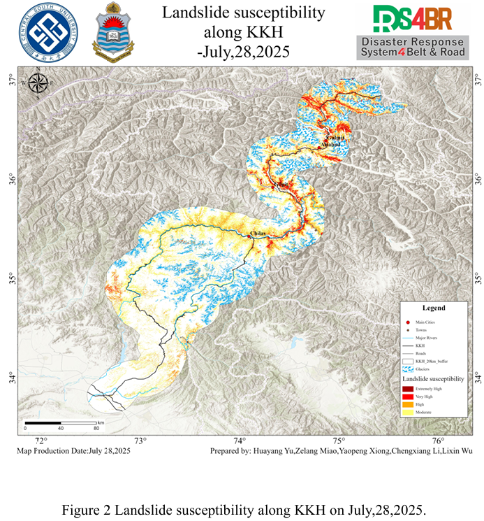 从易发性结果可以看出,沿 KKH 穿越的Chilas-Gilgit路段、Attabad周边区域 、Gulmit 以北段等高易发性路段应被视为重点风险区段,需重点关注在降雨过程中与雨后的高陡切坡、泥石流等灾害。