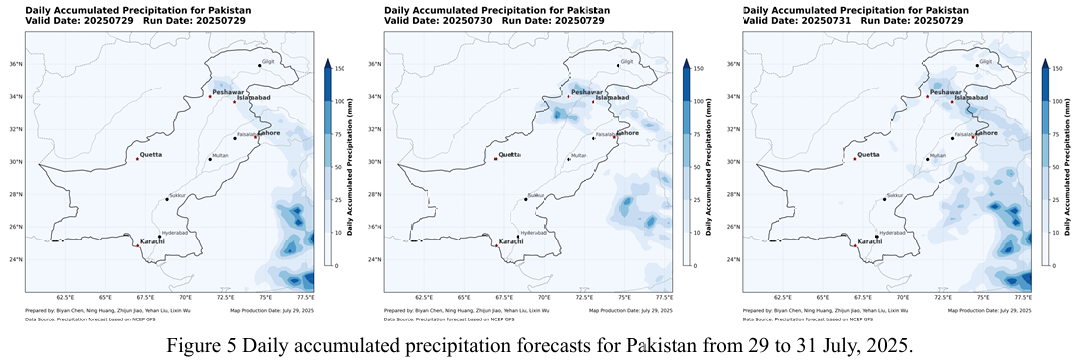 Fig. 5 presents the NCFP GFS global precipitation forecast. The model predicts a new precipitation episode over Punjab and KP provinces from July 29 to 30, with potential for moderate to heavy rainfall. Localized heavy downpours may trigger rapid runoff and increase the risk of secondary geological hazards in mountainous areas. Proactive flood response and mitigation planning are advised for the affected regions.