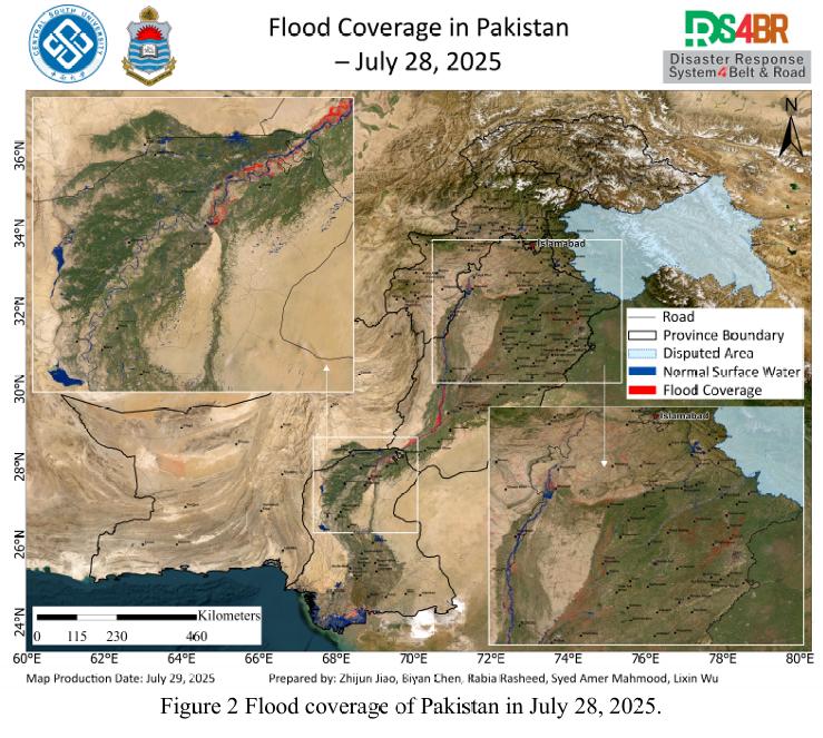Fig. 2 shows the flood inundation extent on July 28. The flooded area further contracted, remaining concentrated around river catchments and low-lying basins. Seasonal streams and some reservoir zones still retained residual water. Farmlands in parts of Punjab Province continued to be affected by surface flooding.