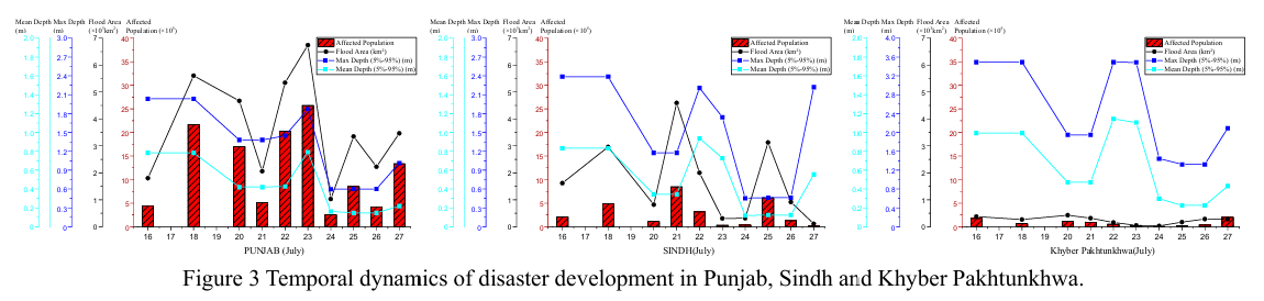 Fig. 3 illustrates the spatiotemporal evolution of flood conditions in Punjab, Sindh, and Khyber Pakhtunkhwa (KP) provinces since July 16, 2025. Remote sensing-based evaluation indicates a continuous recession trend in flood extent. Punjab Province exhibits a substantially larger inundated area and affected population compared to Sindh and KP. Most flooded regions exhibit shallow water depth (<0.5 m), although main channels of the Indus River and selected reservoirs still show depths exceeding several meters.