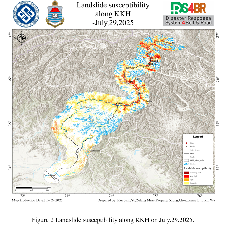 从易发性结果可以看出,沿 KKH 穿越的Chilas-Gilgit路段、Attabad周边区域 、Gulmit以北段等高易发性路段应被视为重点风险区段,需重点关注在降雨过程中与雨后的高陡切坡、泥石流等灾害。