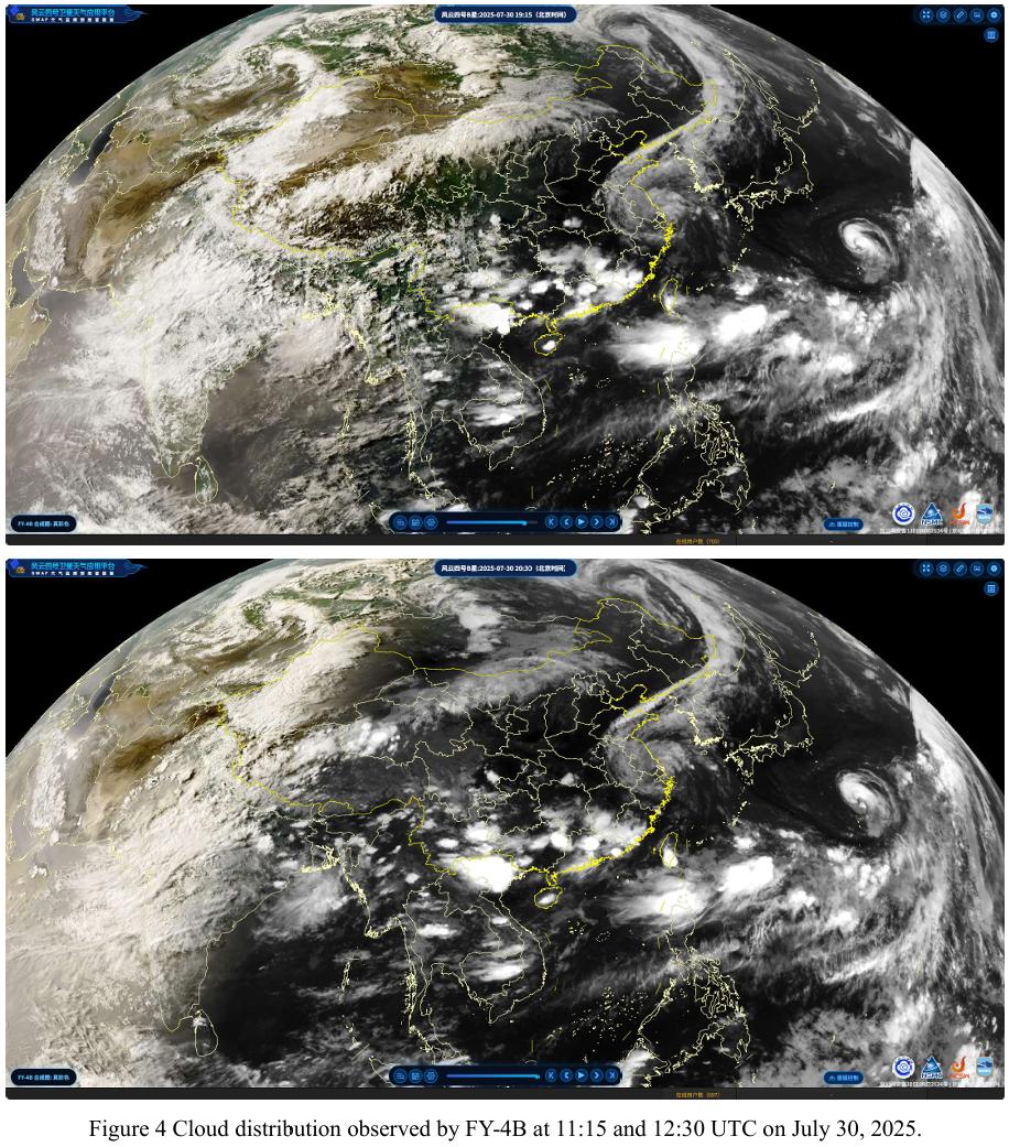 图4为FY-4B静止气象卫星于2025年7月29日11时(UTC)获取的强对流云团分布图。监测结果显示,一片大范围强对流云团正快速向巴基斯坦境内推进,特别是信德和KP山区面临较高强降水和局地强对流天气风险,需引起高度重视。
