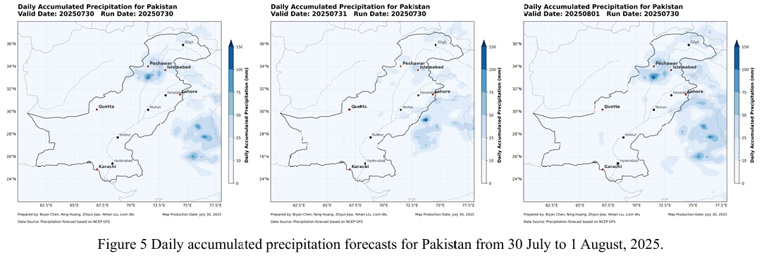 Fig. 4, derived from FY-4B geostationary satellite imagery at 11:00 UTC on July 29, shows a large convective cloud system advancing toward Pakistan. This poses an elevated risk of heavy precipitation and localized severe weather, particularly in mountainous areas of Sindh and KP, warranting heightened vigilance.