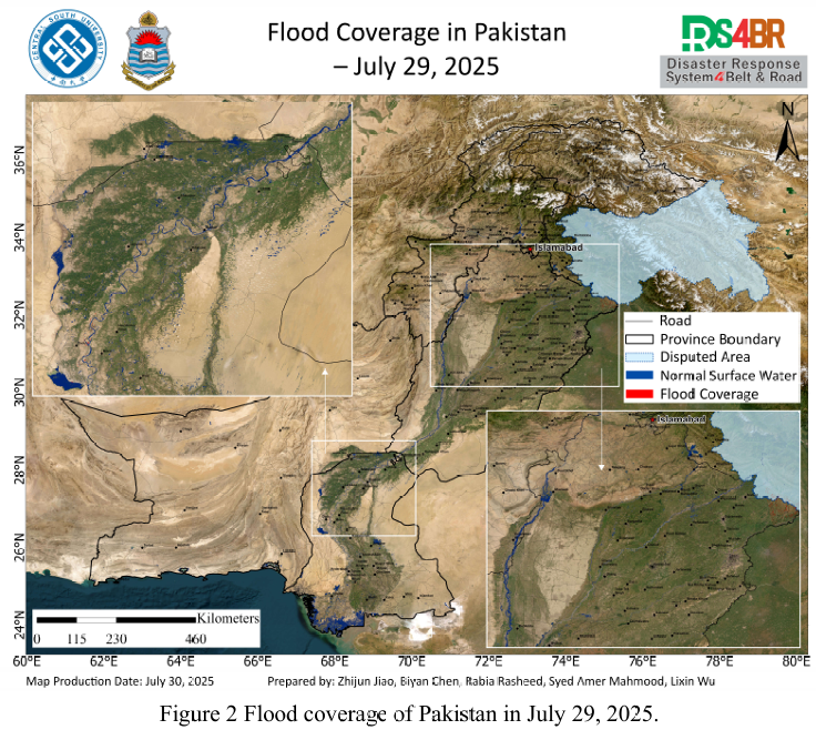 Based on multi-source remote sensing data acquired between July 16 and 29, 2025, including Sentinel-1, Sentinel-2, Landsat-8, and Landsat-9, combined with the KDFIMv2 algorithm, a dynamic monitoring and comprehensive assessment of flood inundation extent and water depth was conducted across Pakistan.