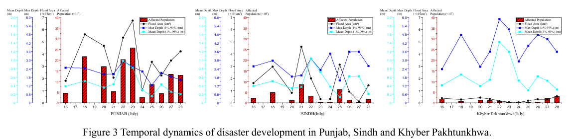 Fig. 1 illustrates the spatial distribution of flood water depth on July 28, 2025. The analysis indicates that large areas of farmland in Punjab Province remain inundated, and the water surface expansion along the Indus River mainstem has stabilized. In contrast, flood conditions in Sindh and Khyber Pakhtunkhwa (KP) Provinces appear relatively mild, with limited inundation extent and shallow depths.