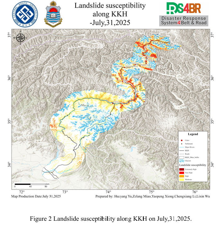 Combined with the precipitation forecast based on the NCFP GFS model on July 31, 2025 and multi-source data such as lithology, DEM and hydrological conditions along the Karakoram Highway, the TRIGRS model was adopted to conduct the landslide risk assessment in the northern area that was greatly affected by rainfall. The NCEP GFS precipitation forecast indicates that on July 31st, the rainfall along the Karakoram Highway will be relatively low, mainly concentrated in the southern region in terms of spatial distribution, with less rainfall in the northern mountainous areas. At this time, the infiltration of rainfall further increases the pore water pressure of the slope body, significantly reducing the effective stress and shear strength, and is prone to form a local saturated weak layer. These factors will cause the slope to rapidly evolve from the critical stable state to the instability threshold in the TRIGRS model, and the triggering probability of shallow collapses, slides or small debris flows will increase significantly.