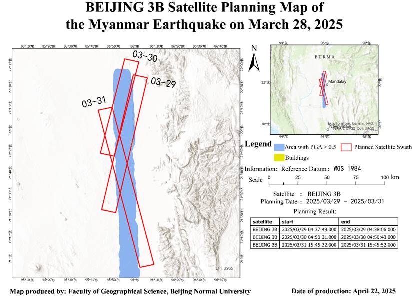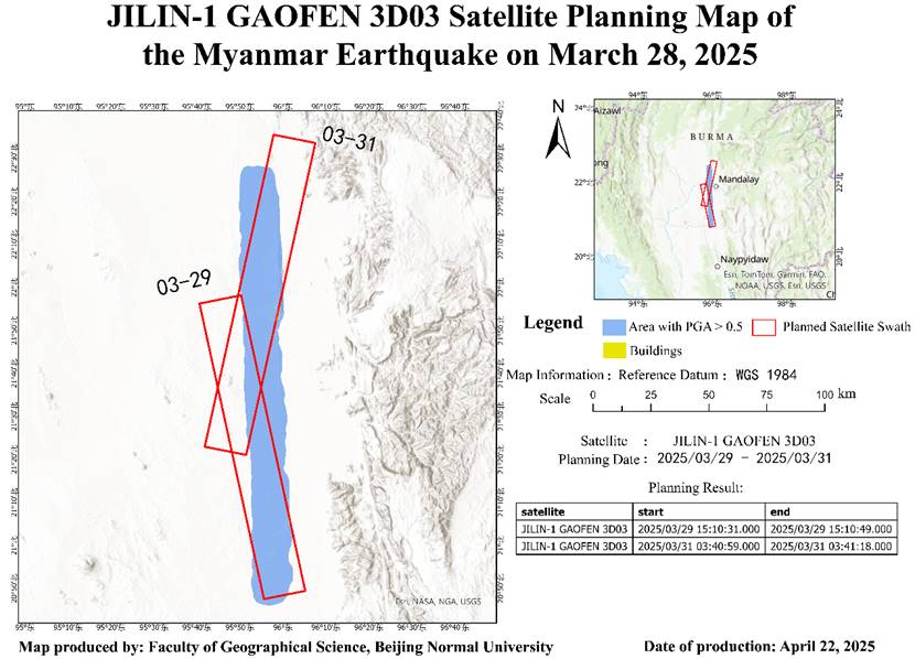 At 14:20 on March 28, 2025, a magnitude 7.9 earthquake occurred in central Myanmar. After the project team initiated the emergency response, seismic parameters such as PGA released by the USGS were promptly obtained. Based on PGA and taking into account the pre-earthquake distribution of buildings, imaging targets for the emergency satellite mission planning were set ( Figure 2).